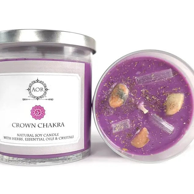 Let go of your attachments and preoccupations, be still, and attune yourself with your spiritual essence. Our Crown Chakra Candle is full of herbs, essential oils, and topped with crystals revered for their power to help clear your mind, center yourself, and revel in all that life offers, in both the physical and spiritual realm. Take in the warm glow, the deep rich violet, and the pleasant, peaceful aroma, and open yourself to the infinite possibilities. Our Crown Chakra Soy Candle is made with soy wax and comes in an 8.5 oz. glass container.