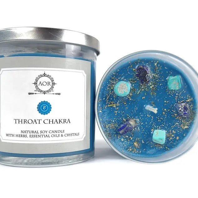 Into the soy wax of this Throat Chakra Soy Candle some amazing herbs to help balance the Throat Chakra; Jasmine and lavender to relax your mind and make a deep spiritual connection to allow you to discover your true aspirations. Sage and red clover helps banish negativity or uncertainty and bring about clarity. Coltsfoot helps you achieve acute mental focus, and cypress lends to emotional growth to enhance confidence in your convictions. With this careful blend, you will be well on your way to a healthy and balanced Throat Chakra.