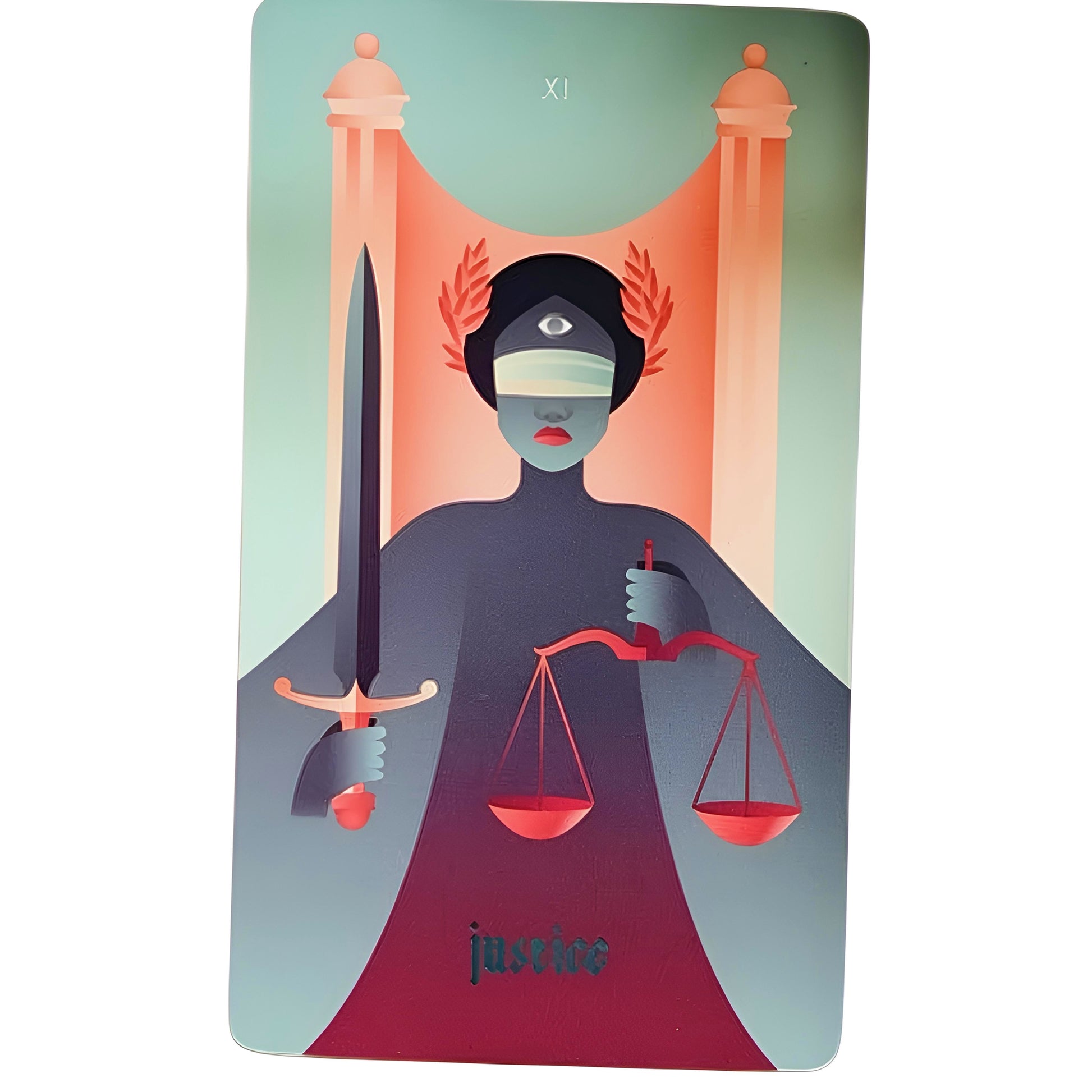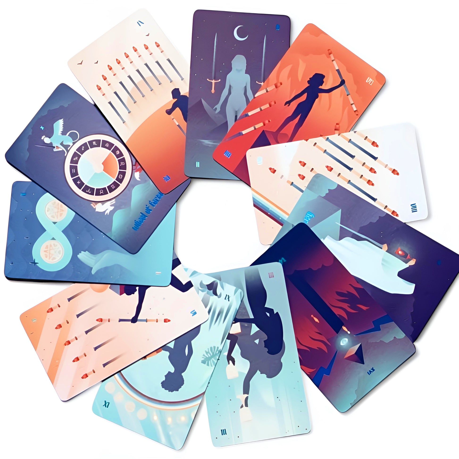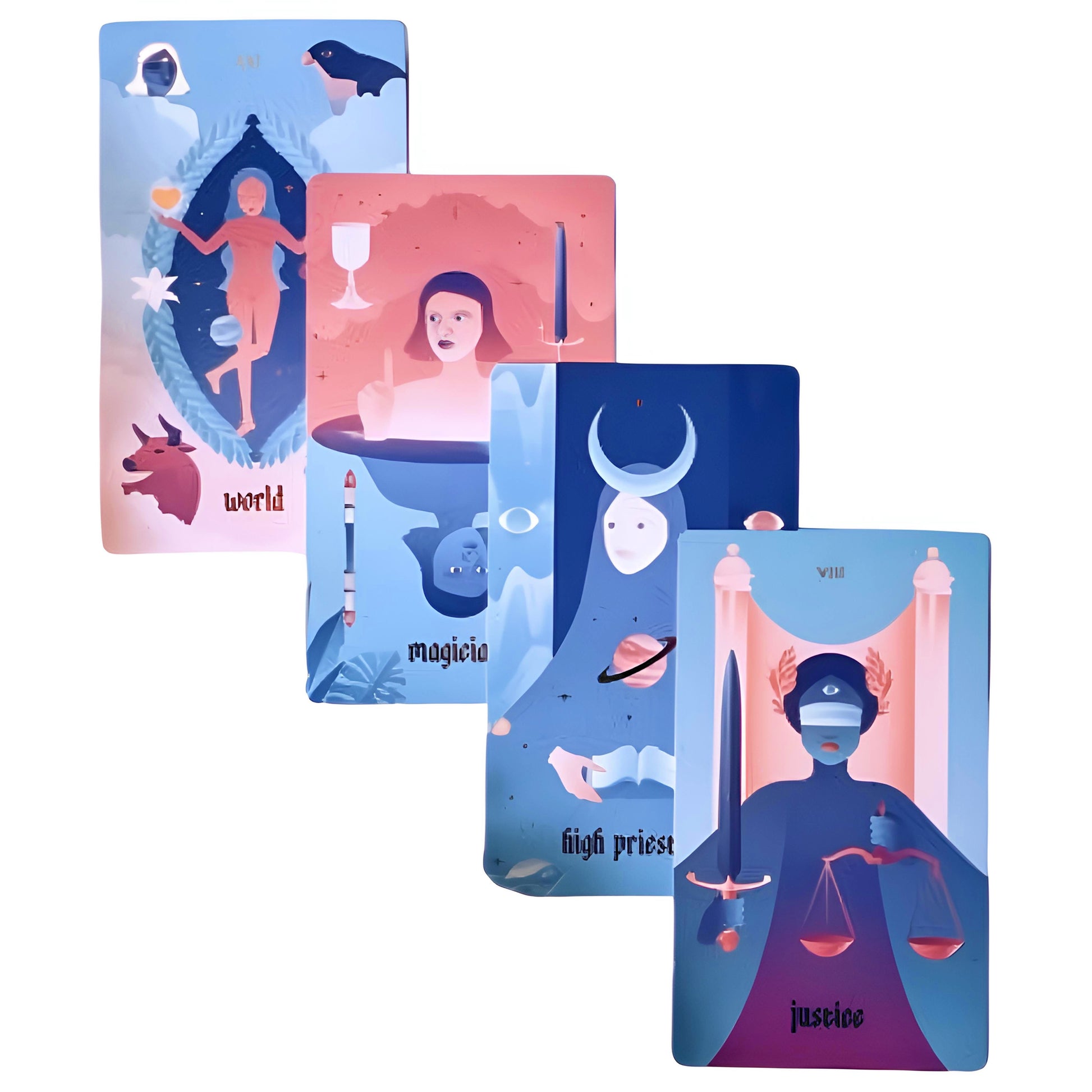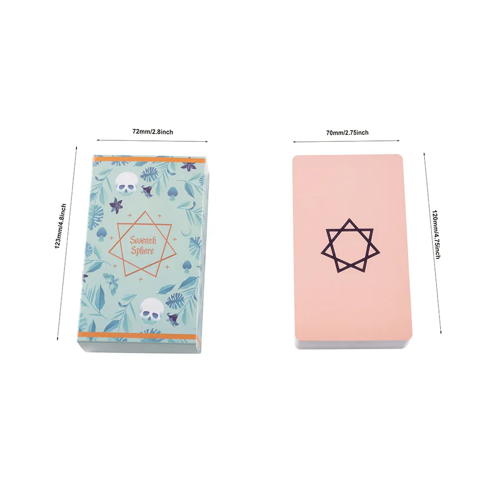 A modern Marseille tarot deck featuring rose gold detailing, rose gold edges, and bright, gentle, colorful full-bleed illustrations. Companion to the Seventh Sphere Lenormand deck.