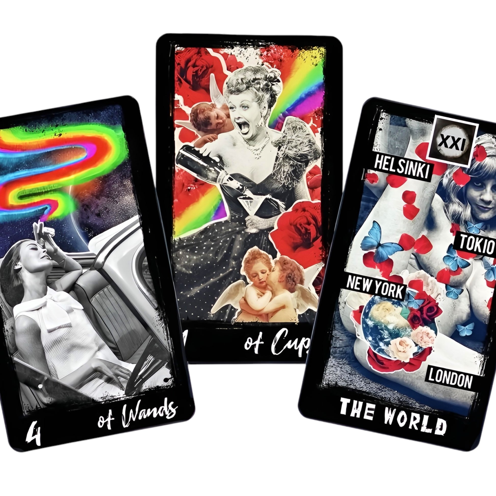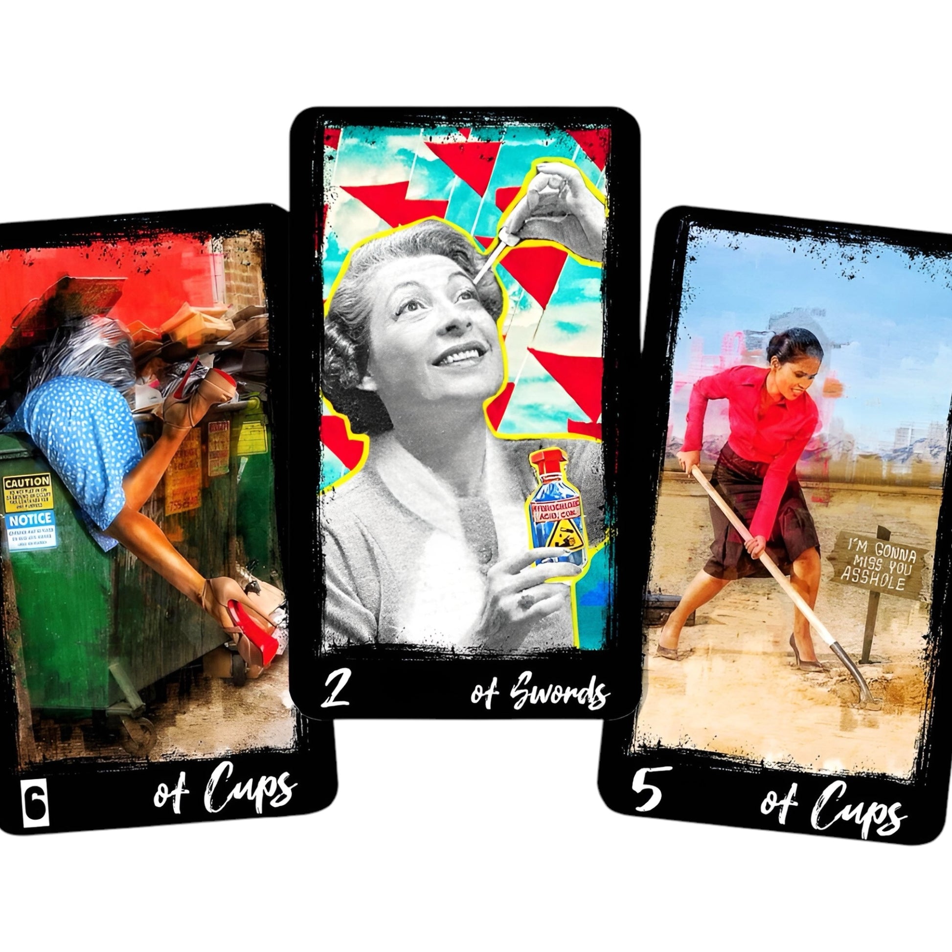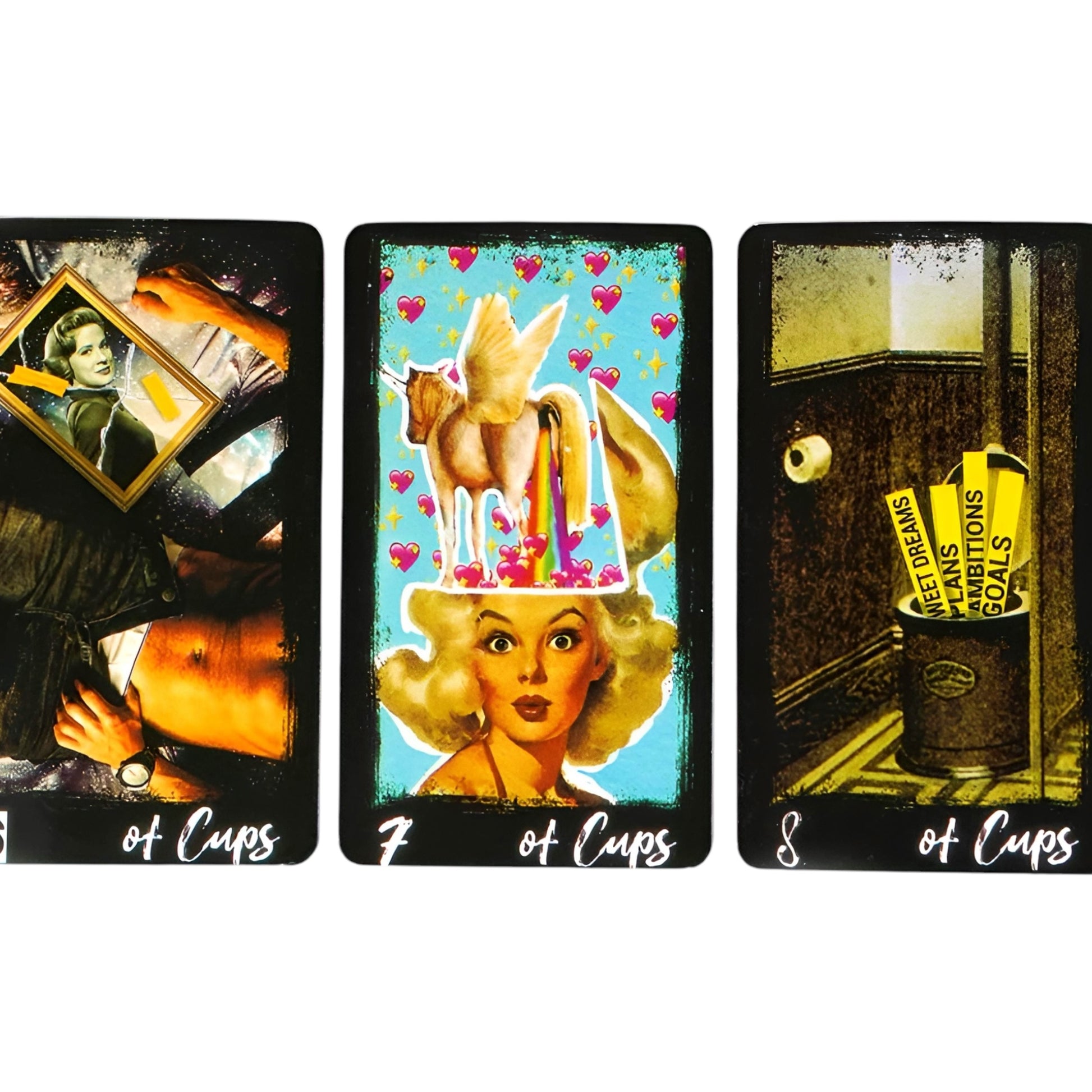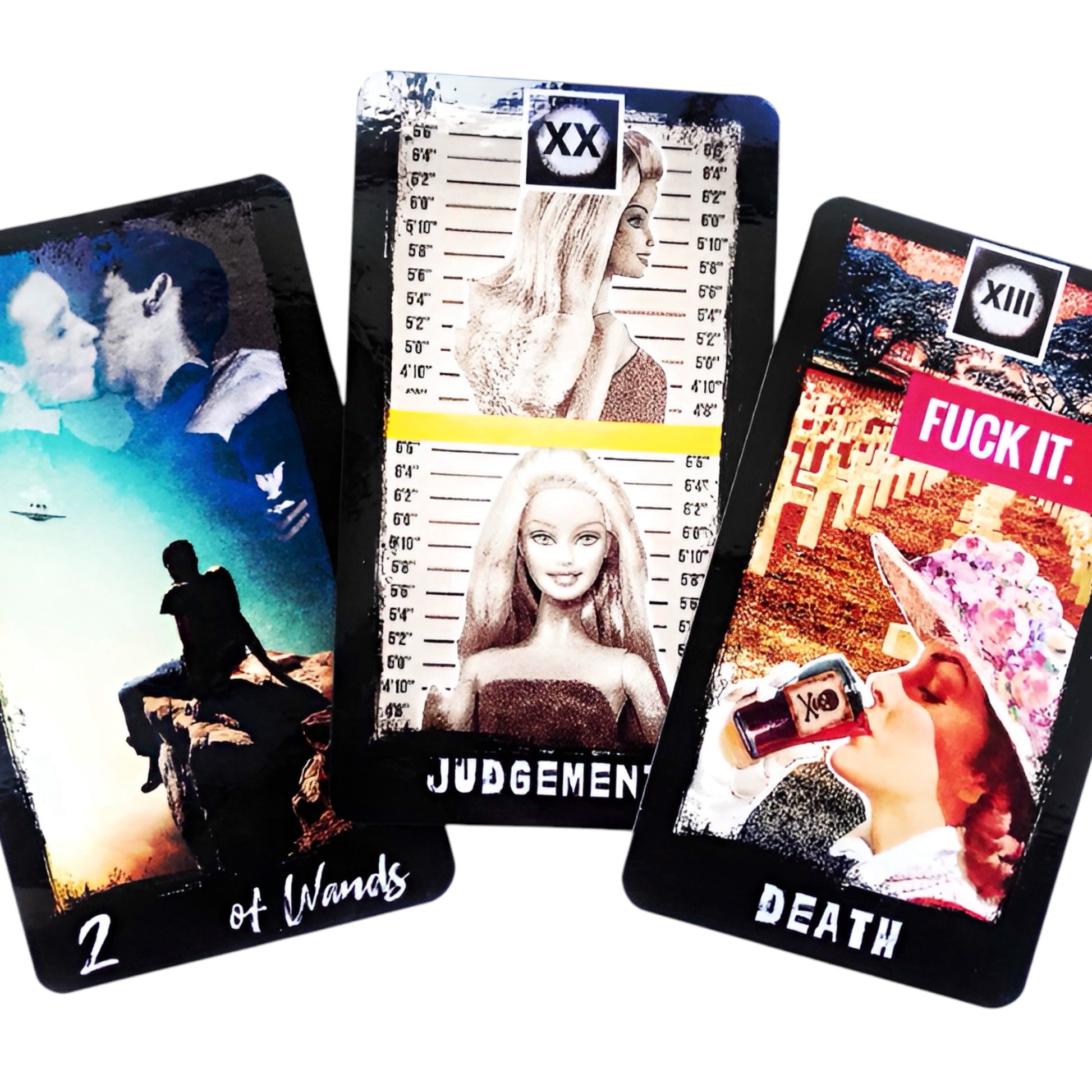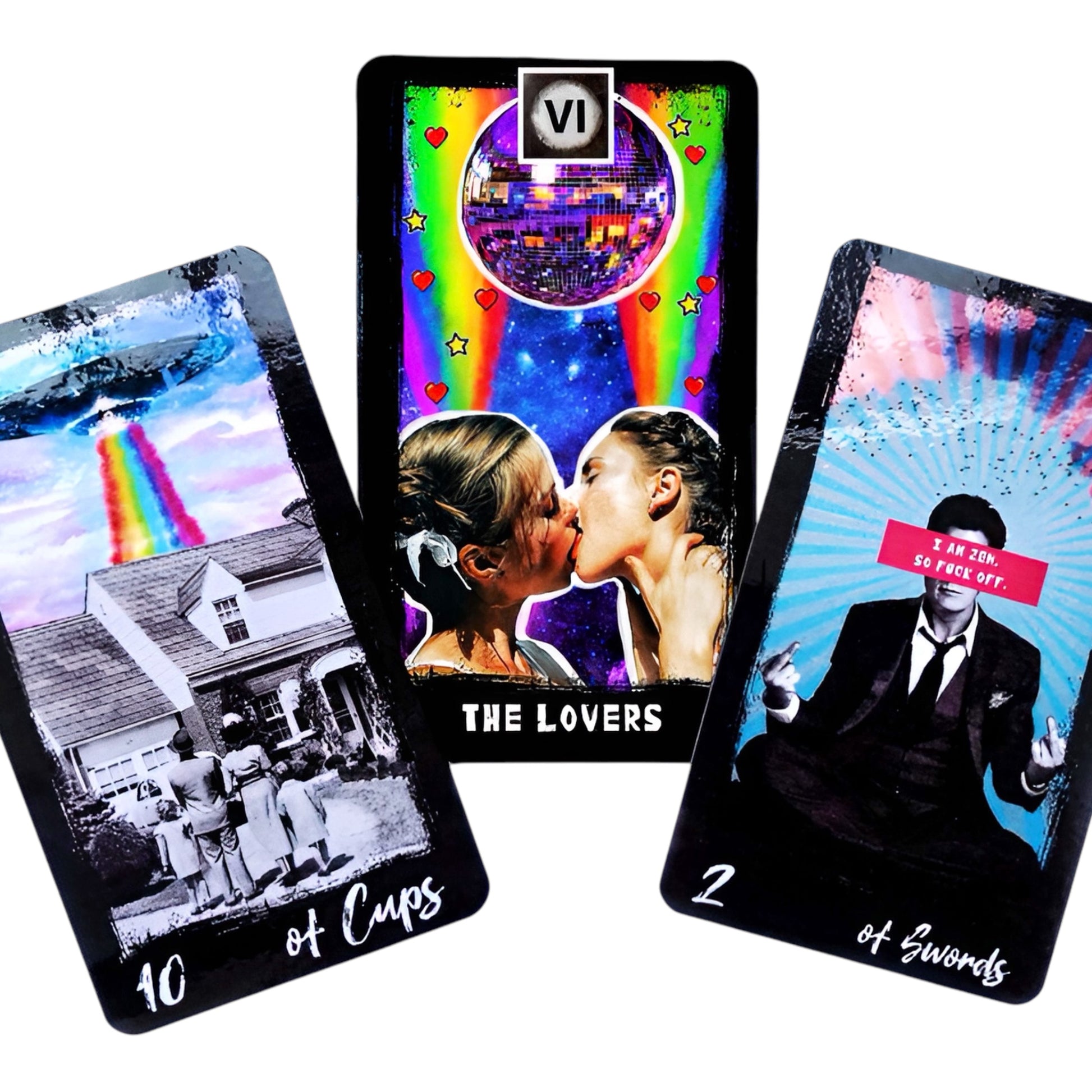 This deck is based on the RWS system, but for sure is a stand-alone piece of pop art reference! No guidebook is included, but honestly, that is the best part about this deck! You don’t need it! The images are amazing and sometimes shocking and mostly hilarious, but they are not only open to the reader’s interpretation but also SUPPOSED to challenge the status quo of tarot itself.