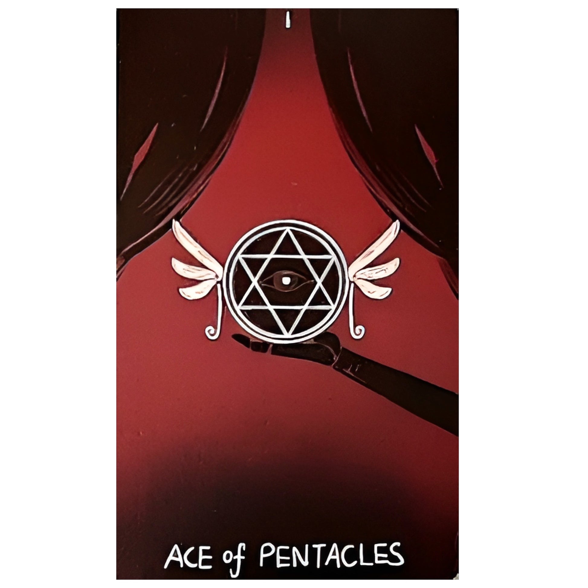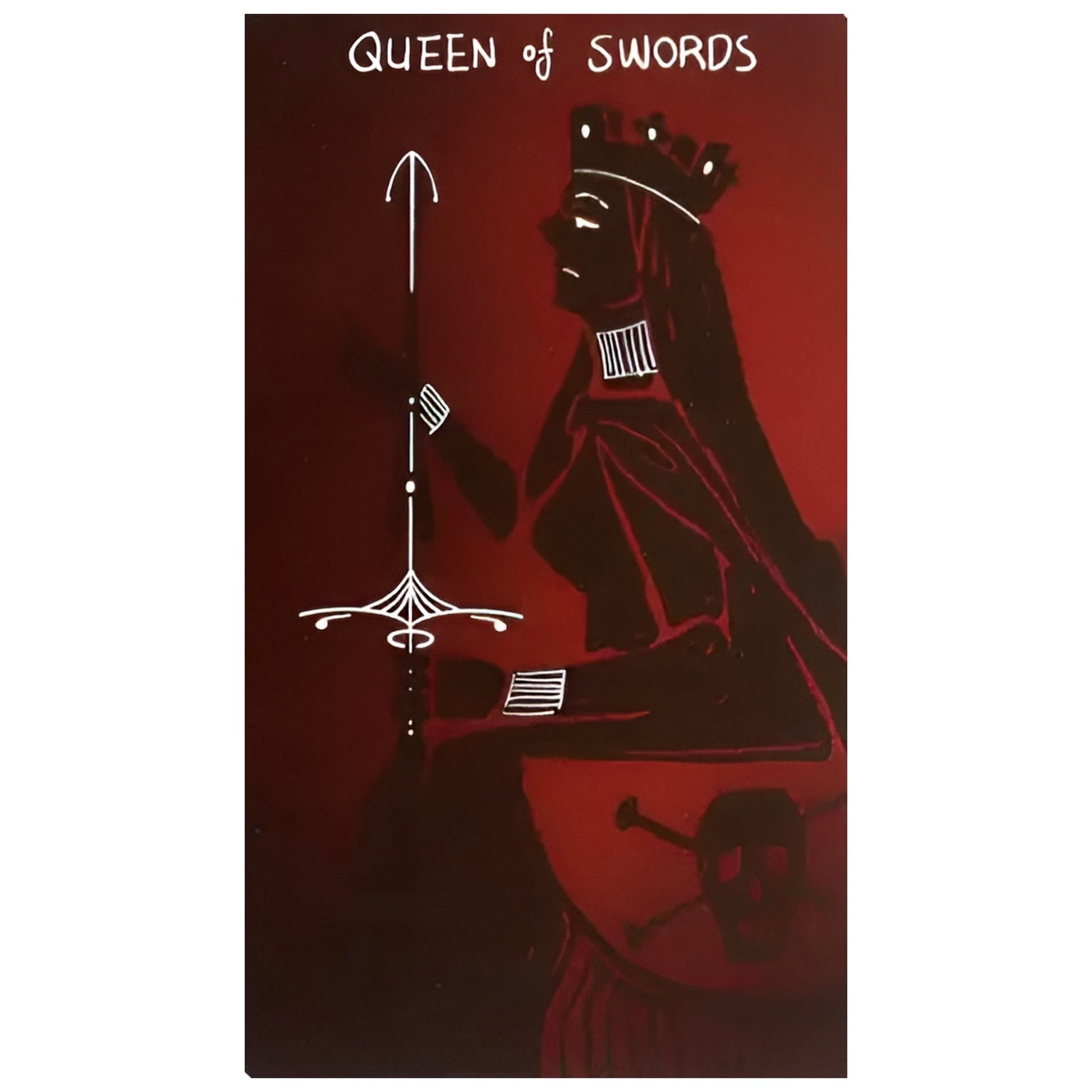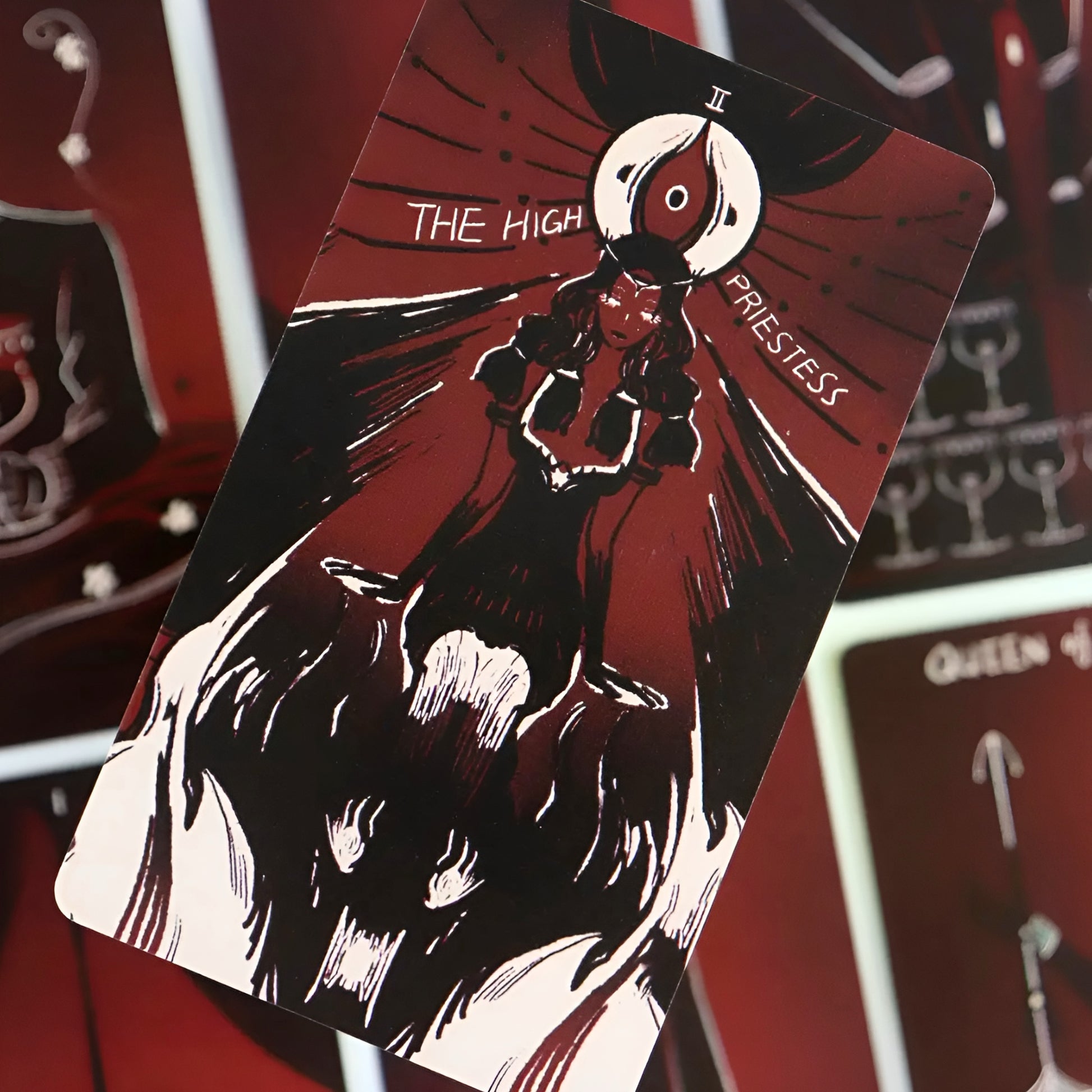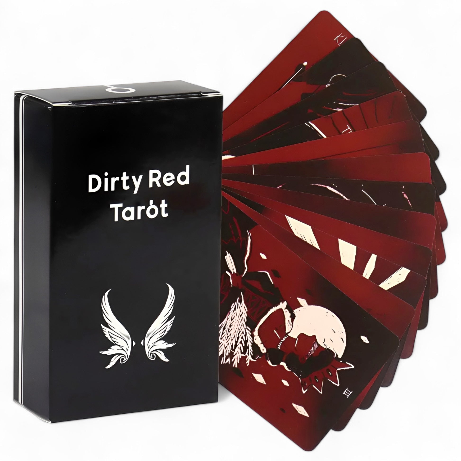 The Dirty Red Tarot is an intuitive and raw divination deck that channels energy through bold strokes and striking contrasts. Created with a unique spray paint brush technique, its artwork blends deep red and black tones with expressive, almost chaotic textures. This deck embodies spontaneity, mystery, and the beauty of imperfection, making it a powerful tool for those who seek insight beyond the surface. Each card captures the unpredictable nature of life, offering clarity, guidance, and a connection to hidden truths.Â