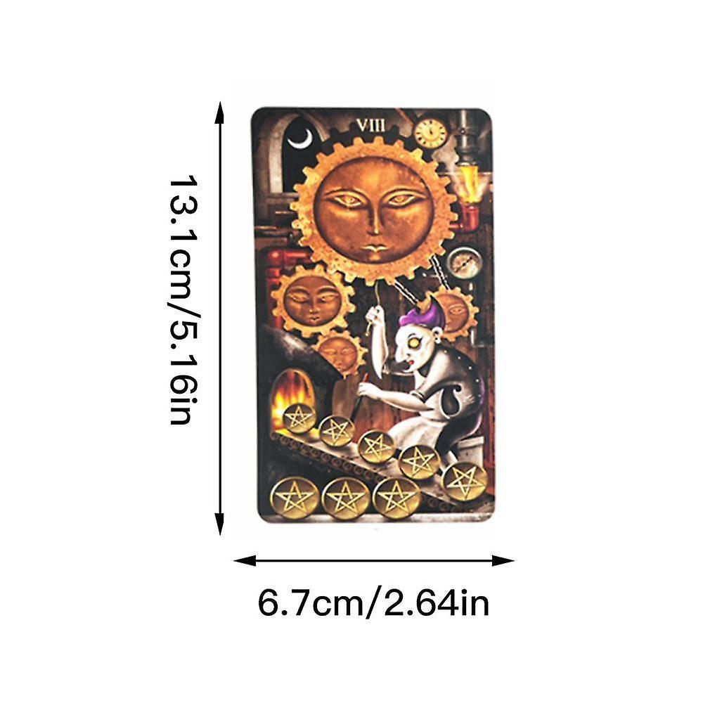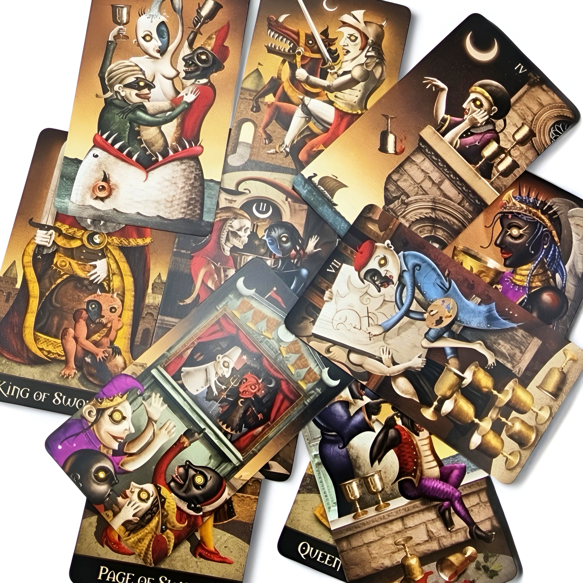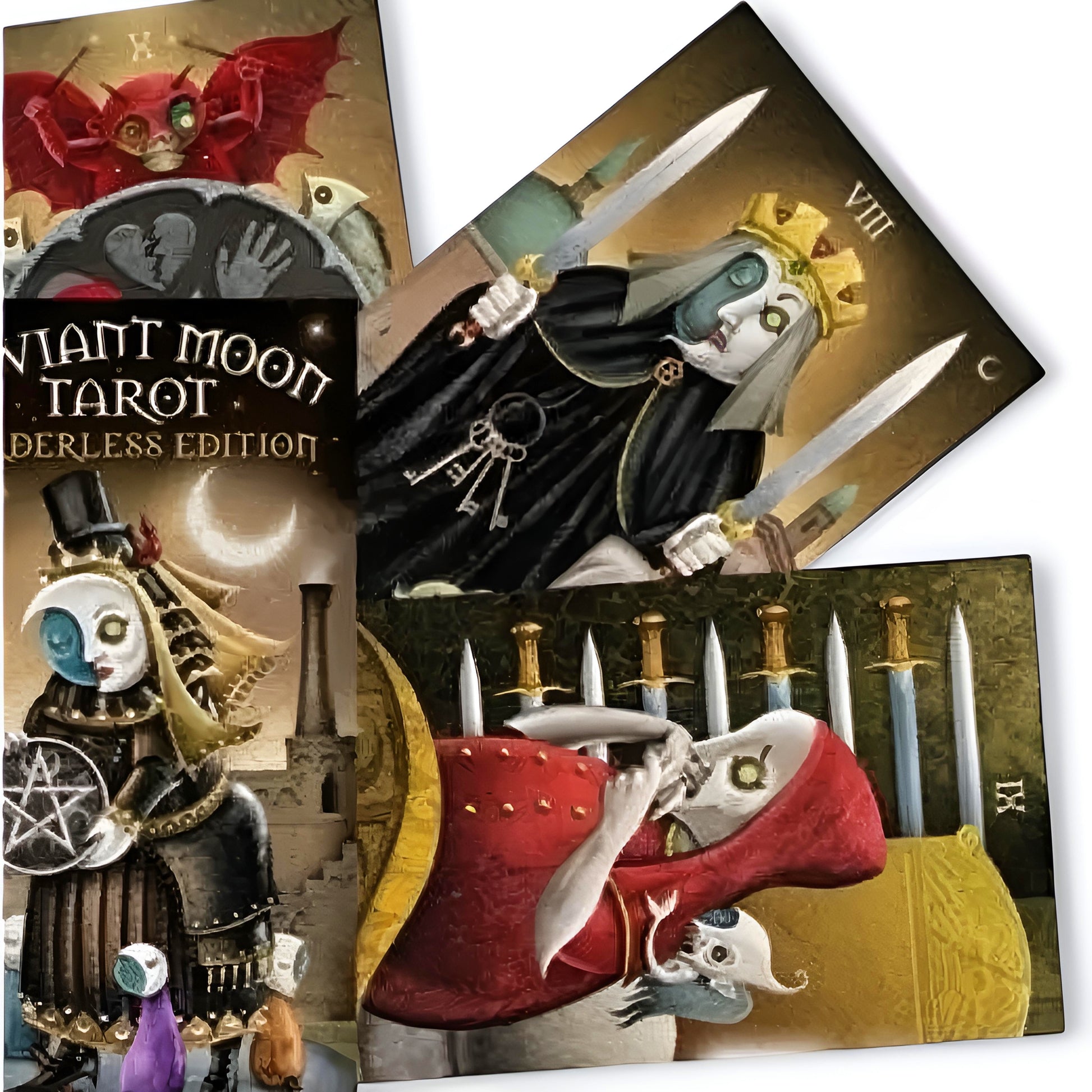Talented artist Patrick Valenza presents uniquely alternative interpretations of traditional tarot with symbolism inspired by childhood dreams. Stylized moon-faced characters created from manipulated photographs of 18th century tombstones are set against evocative backgrounds. Incorporated into the artwork are surreal scenes of distant smoke stacks, insane asylums, and abandoned buildings. The symmetric card backs, showing different phases of the moon, allow for reversed readings. Deviant Moon Tarot has drawn something of a cult following and was voted as the Top Tarot Deck of All Time by Aeclectic Tarot readers.
