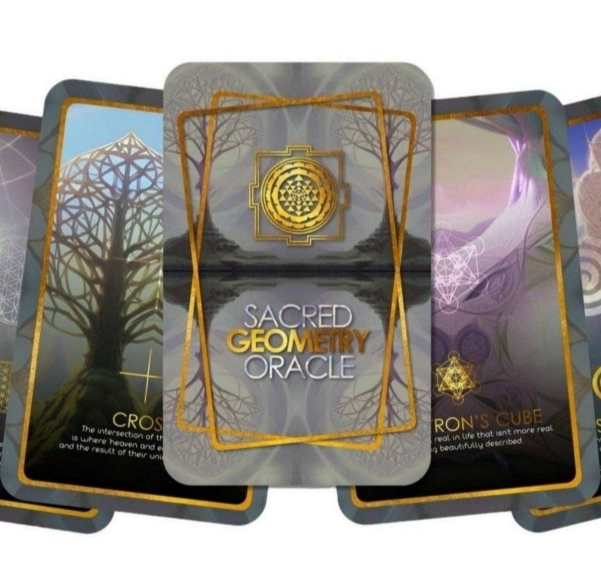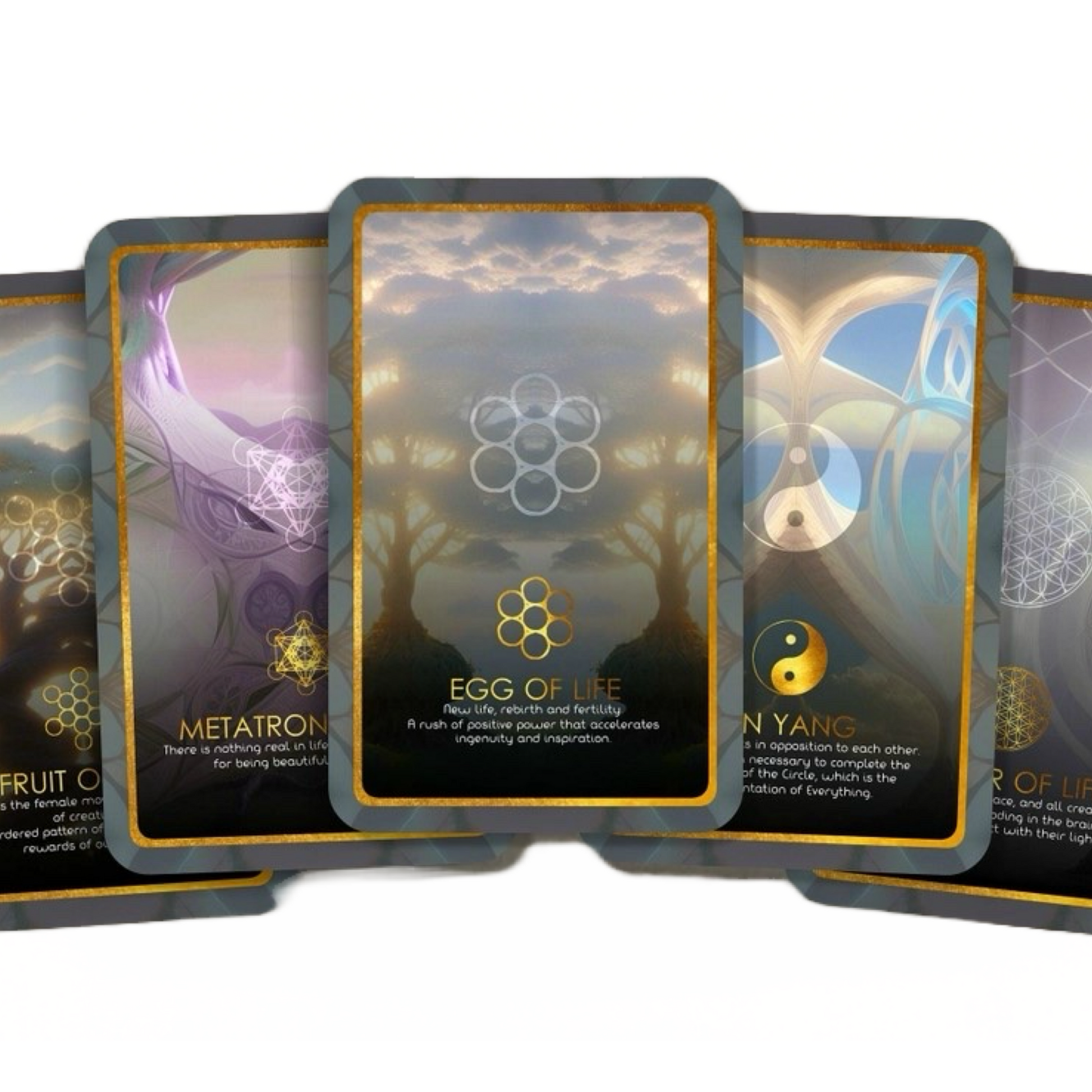 The Sacred Geometry Oracle deck is a mesmerizing and insightful creation that delves into the profound world of sacred geometry. This deck is designed to explore the intricate geometrical shapes and patterns that are believed to be the foundational blueprints of life and the universe, emanating from the one consciousness that underlies all existence.