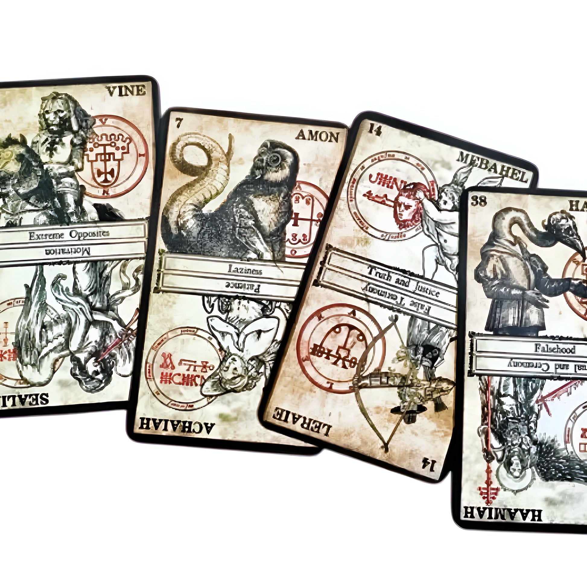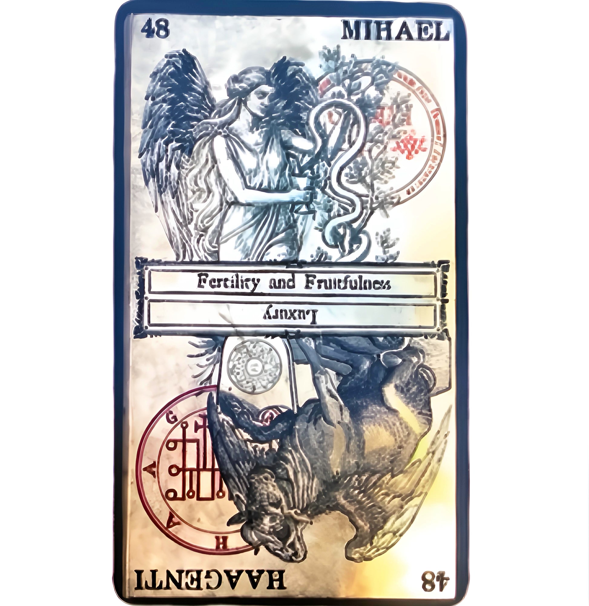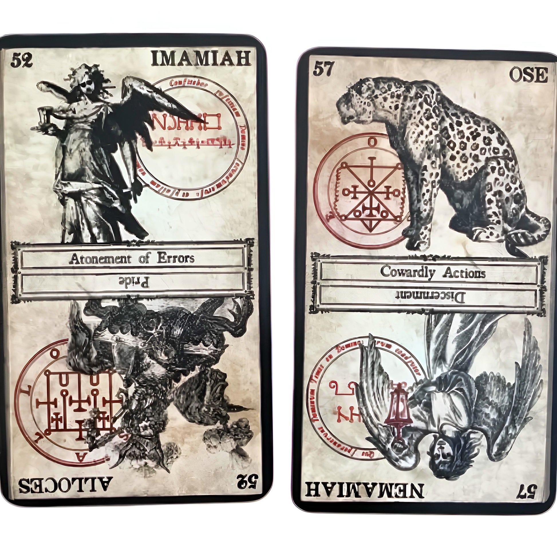 Based on the angels and demons of the Shemhamforash, the Oracle of Heaven and Hell contains 77 cards combining infernal and divine powers. Each card contains the image of one Goetic Demon and the Kabbalistic Angel that rules over that demon. In addition to drawings of the spirits, their summoning sigils are shown in stark red contrast behind them. For ease of reading, the astrological meaning of each spirit is printed on the card.